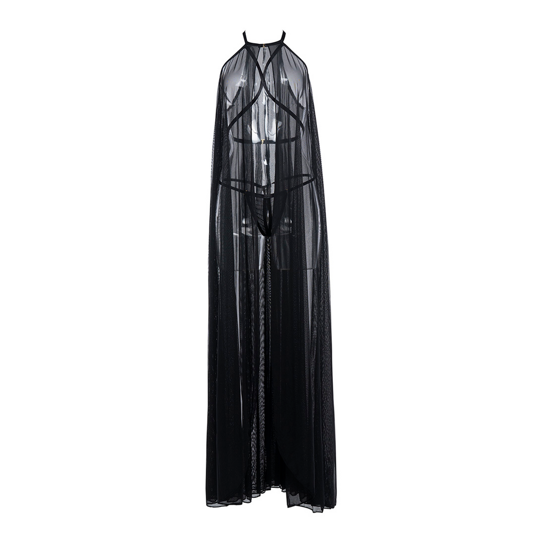 Als uitkleden een kunst is… dan is dit stuk een meesterwerk. Deze schouderbare sheer mesh cape is absoluut goddelijk met verstelbare criss-cross schouderbanden om je beste eigenschappen te contouren en te accentueren. Zeker een must-have voor moeiteloos boudoir aankleden. Wordt geleverd met een open voorkant G-string.