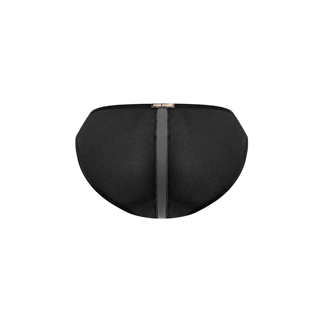 From the Landing Strip collection by Male Power, the Bikini Brief, features thin plush elastic trim on waist and legs, tone on tone matt onyx insert strip through the pouch and rear and a decorative metallic brand label on rear waistband.