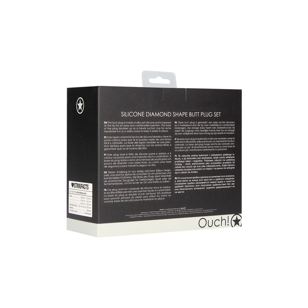 De set bevat 3 pluggen van verschillende grootte.De taps toelopende punt zorgt voor een gemakkelijke en comfortabele inbrengingDe basis van de plug heeft een zuignap die je handsfree plezier biedt.De basis werkt ook als veiligheidsbasis om de stekker veilig op zijn plaats te houden.Beleef ongelooflijke sensaties met dit speeltje van Ouch/