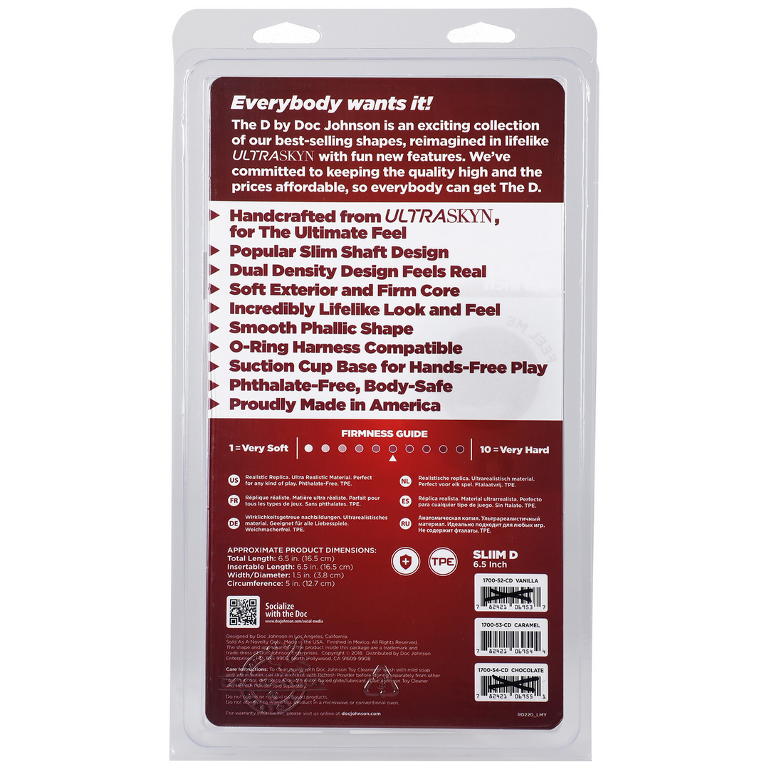 De Slim D, een van de meest populaire vormen van Doc Johnson, heeft een breedte die aangenaam en comfortabel is voor de meeste lichamen en is verkrijgbaar in zowel FIRMSKYN als ULTRASKYN met dubbele dichtheid. ULTRASKYN met dubbele dichtheid voelt warm aan en is ontworpen met een zachte buitenkant en stevige kern om het gevoel van een echte penis na te bootsen, terwijl de FIRMSKYN-optie een steviger gevoel biedt in een klassiek materiaal voor genotsproducten.
