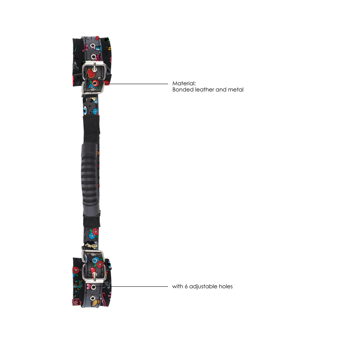 Houd je partner van achteren vast met het handvatDeze handboeien hebben een prachtige old school tattoo printVerstelbaar voor een strakke pasvormGebruik in combinatie met andere Ouch productenGemaakt van kwaliteitslederen bandjes met een zachte stof aan de binnenkant/