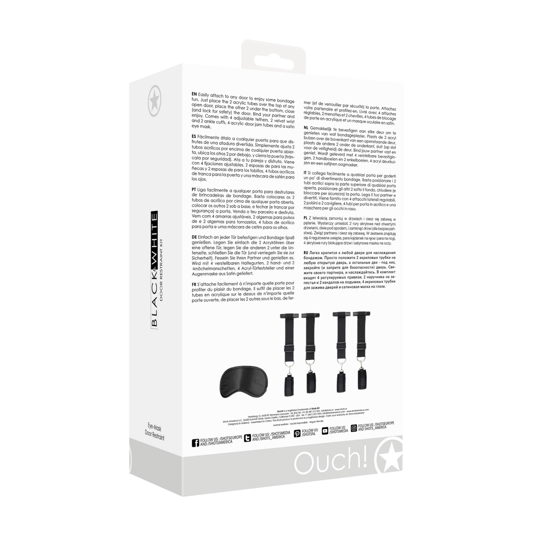 The perfect door restraint set!The box contains everything you need for teasing your partner or more extreme roleplayThis kit is only available in BlackComes with 4 tethers, velvet wrist and ankle cuffs, 4 door jam tubes and a satin eye mask/