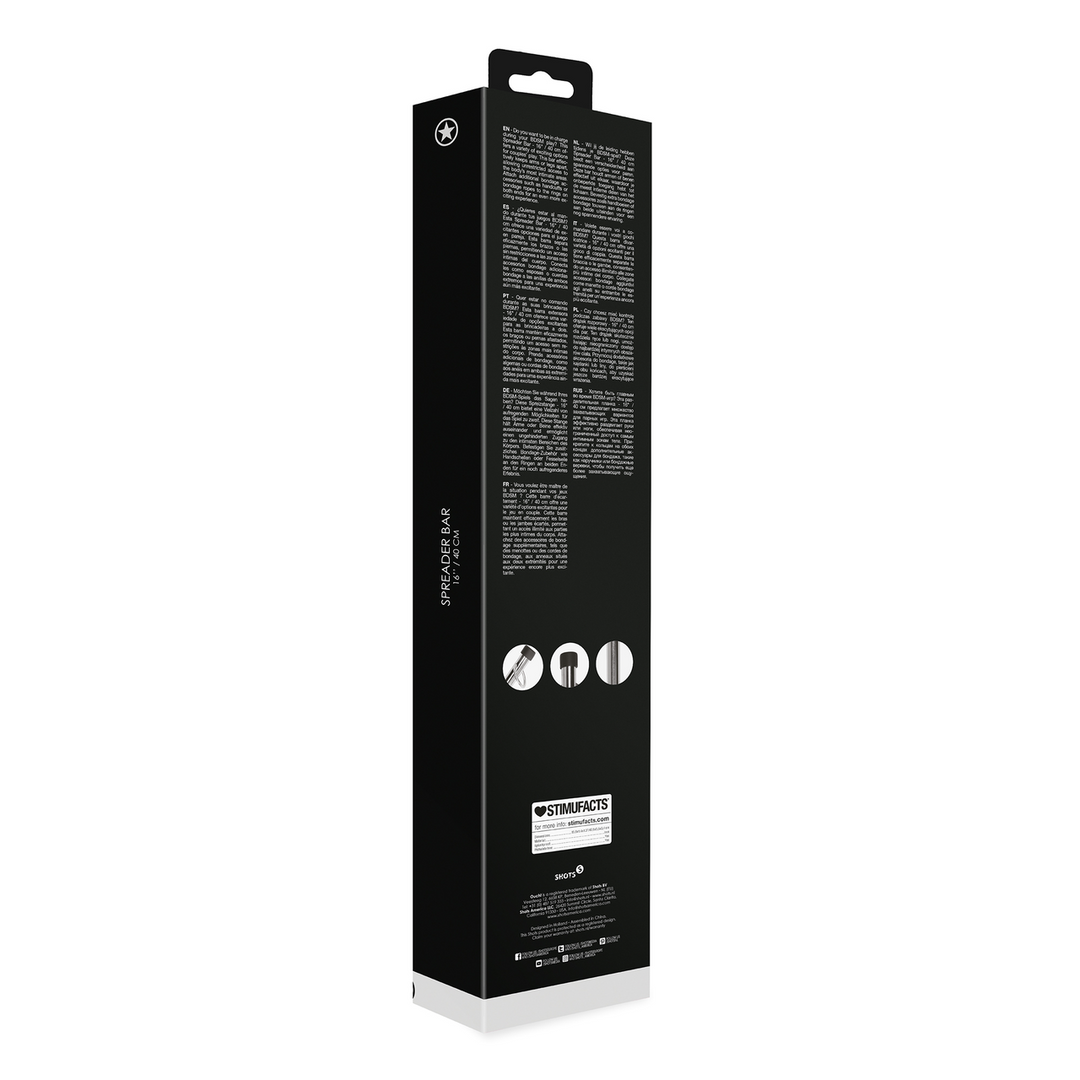 Wil jij de leiding hebben tijdens je BDSM-spel? Deze Spreader Bar – 16” / 40 cm biedt een verscheidenheid aan spannende opties voor paren. Deze bar houdt armen of benen effectief uit elkaar, waardoor je onbeperkte toegang hebt tot de meest intieme delen van het lichaam. Bevestig extra bondage accessoires zoals handboeien of bondage touwen aan de ringen aan beide uiteinden voor een nog spannendere ervaring.