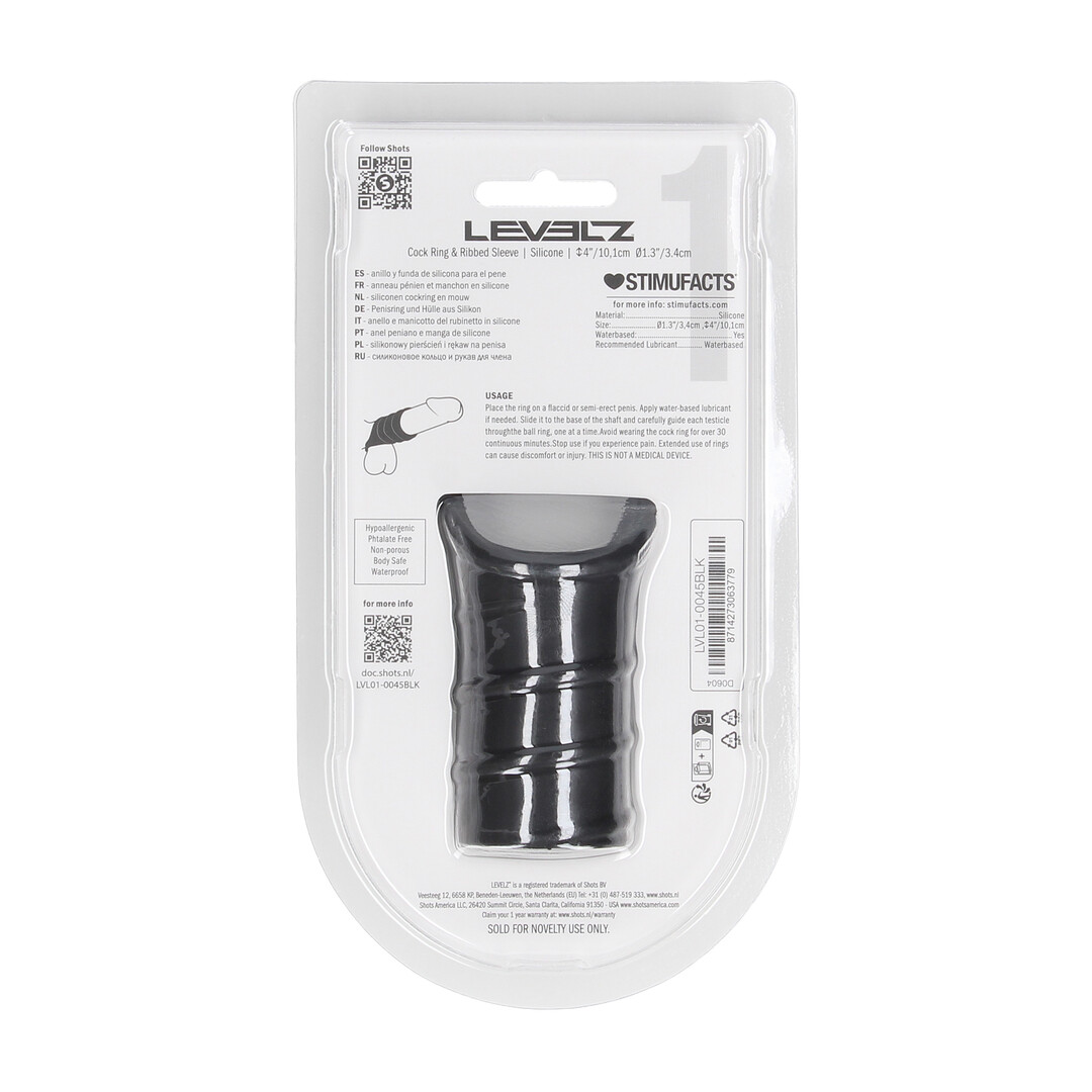 Elevate texture and tension with this unique hybrid from the LEVELZ collection. Featuring a firm cock ring attached to a ribbed silicone sleeve, this non-vibrating design delivers gripping pressure at the base while the textured sleeve stimulates with every move. Crafted from body-safe silicone and packaged in a sleek clamshell, it’s a bold addition to any wall set or pleasure routine.