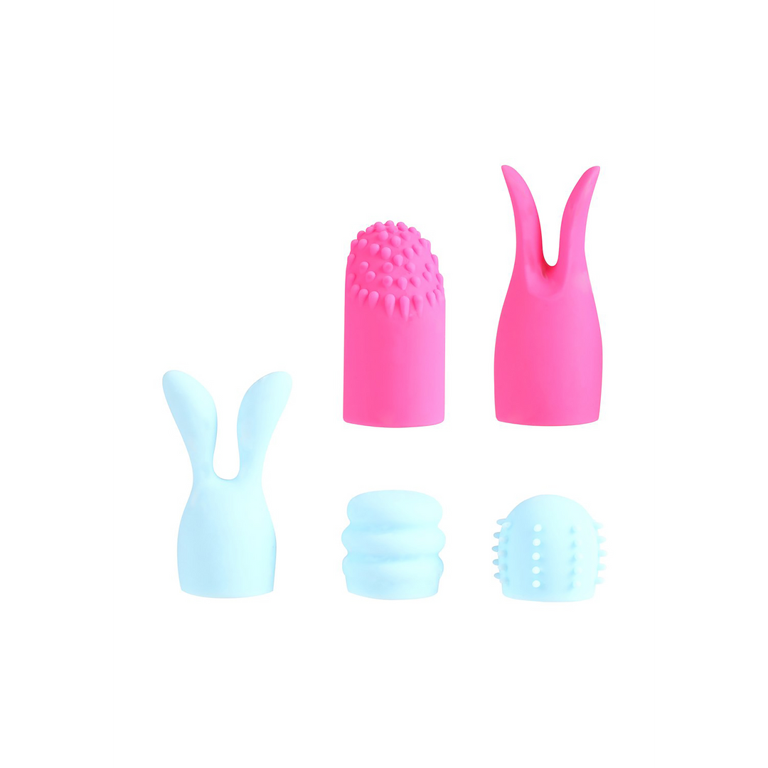 5-Piece Attachment Set (fits Maia and other bullets)(fits Maia and other bullets)100% Medical Grade SiliconeVarious shapes to enhance sensationsNeon Pink and Pastel Blue/