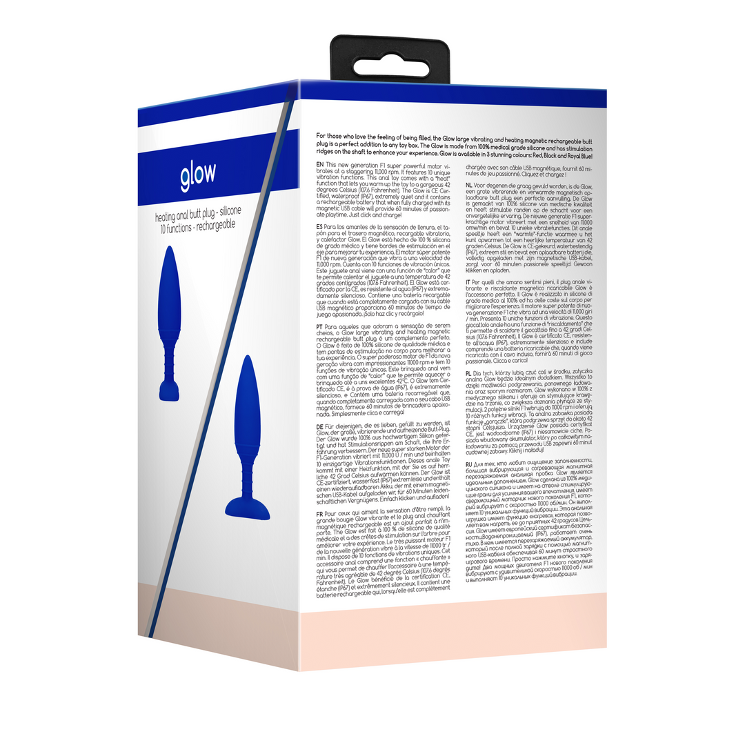 For those who love the feeling of being filled, the Glow large vibrating and heating magnetic rechargeable butt plug is a perfect addition to any toy box. The Glow is made from 100% medical grade silicone and has stimulation ridges on the shaft to enhance your experience. Glow is available in 3 stunning colours: Red, Black and Royal Blue! This new generation F1 super powerful motor vibrates at a staggering 11,000 rpm. It features 10 unique vibration functions. This anal toy comes with a heat function that lets you warm up the toy to a gorgeous 42 degrees Celsius (107.6 Fahrenheit). The Glow is CE Certified, waterproof (IP67), extremely quiet and it contains a rechargeable battery that when fully charged with its magnetic USB cable will provide 60 minutes of passionate playtime. Just click and charge!
