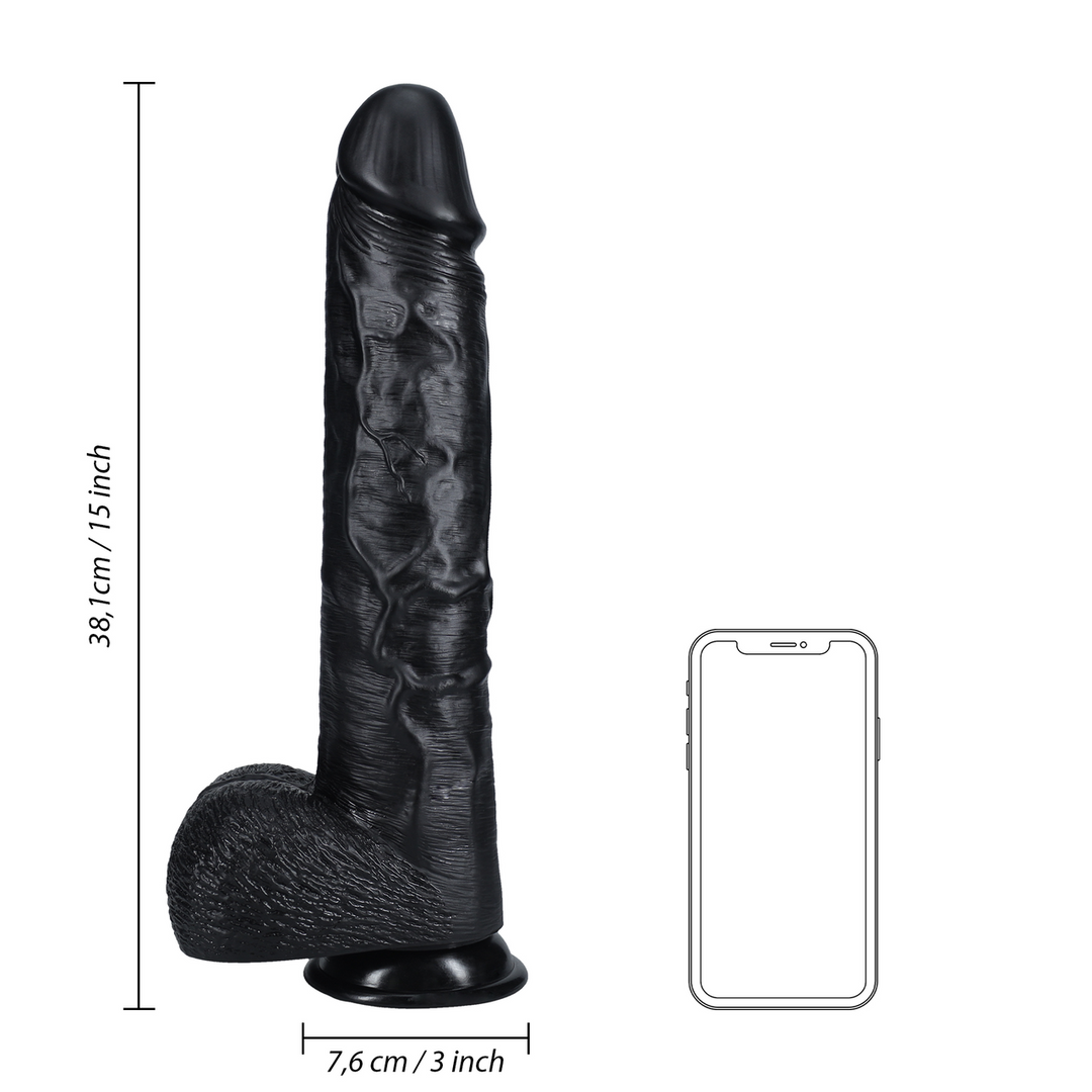 Realistic design: This extra-large straight dildo with balls is crafted for a lifelike and authentic experience, featuring detailed textures and contours.Size: With a length of 15 inches (38 cm), this black variant offers an exceptionally large option for users seeking an intense experience.Balls for added realism: The inclusion of balls enhances the overall realism and provides additional stimulation during use./