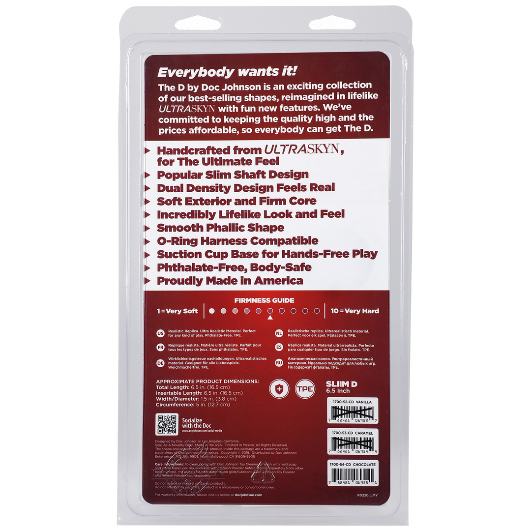 De Slim D, een van de meest populaire vormen van Doc Johnson, heeft een breedte die aangenaam en comfortabel is voor de meeste lichamen en is verkrijgbaar in zowel FIRMSKYN als ULTRASKYN met dubbele dichtheid. ULTRASKYN met dubbele dichtheid voelt warm aan en is ontworpen met een zachte buitenkant en stevige kern om het gevoel van een echte penis na te bootsen, terwijl de FIRMSKYN-optie een steviger gevoel biedt in een klassiek materiaal voor genotsproducten.