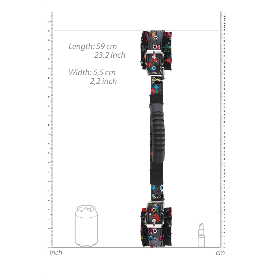 Houd je partner van achteren vast met het handvatDeze handboeien hebben een prachtige old school tattoo printVerstelbaar voor een strakke pasvormGebruik in combinatie met andere Ouch productenGemaakt van kwaliteitslederen bandjes met een zachte stof aan de binnenkant/