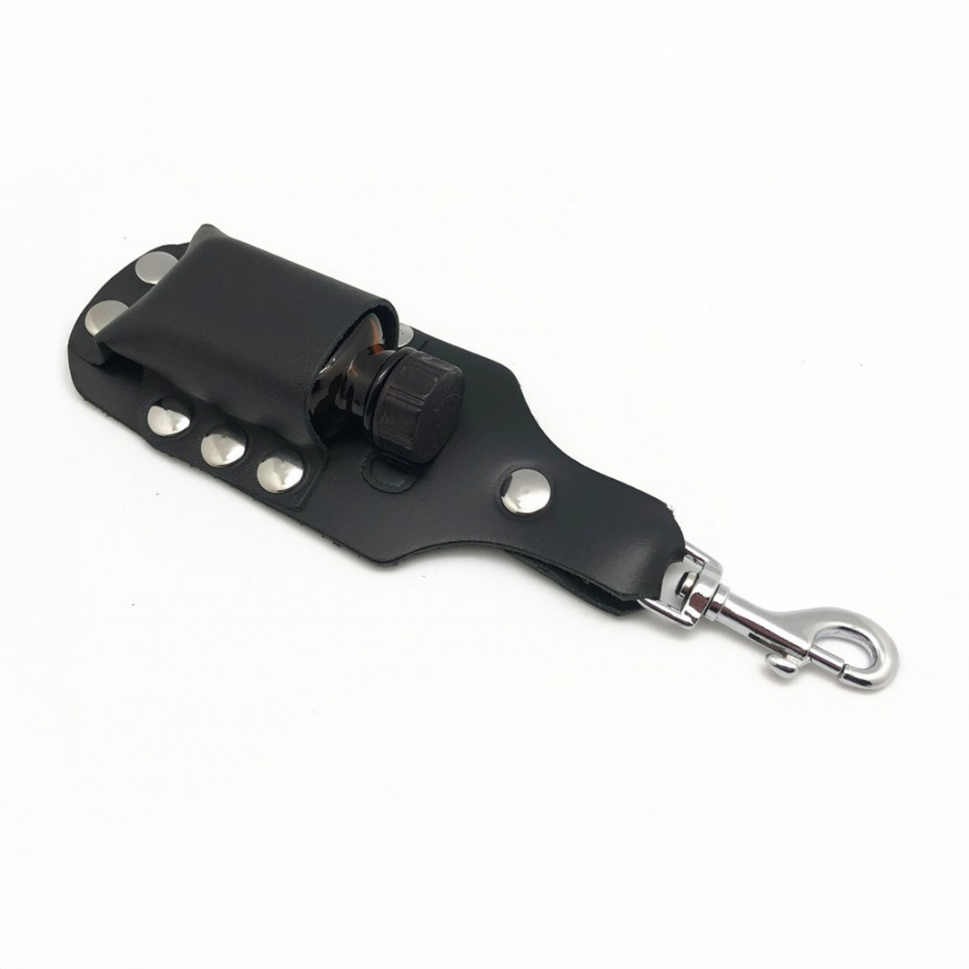 This accessory is a bottle holder for large-format leather cleaner bottles: 24 and 30 mL. It fits onto a belt, harness or other accessory. It is made of genuine leather, with a metal snap hook.
