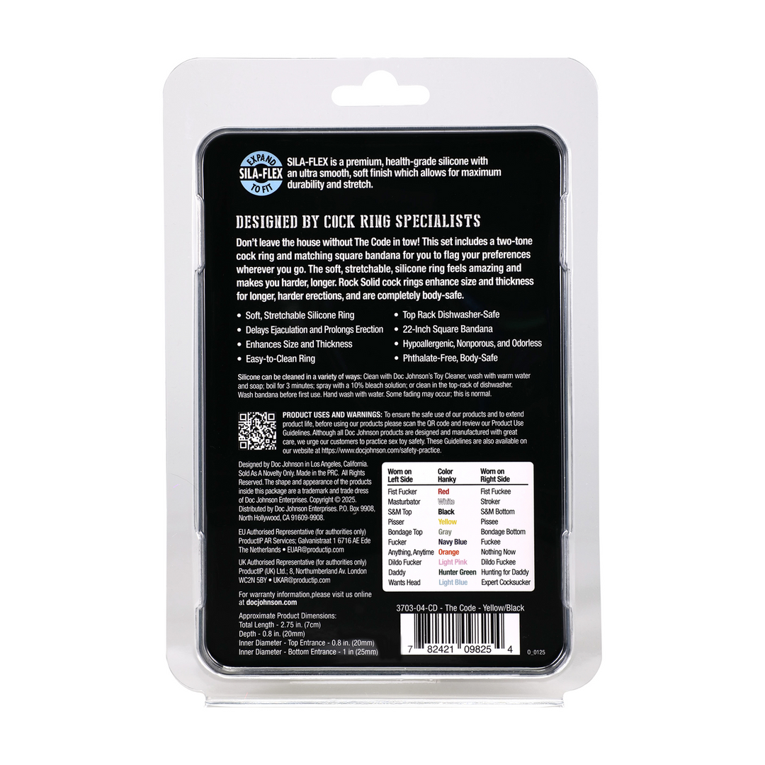 Don’t leave the house without The Code in tow! This set includes a two-tone cock ring and matching square bandana for you to flag your preferences wherever you go. The soft, stretchable, silicone ring feels amazing and makes you harder, longer. Rock Solid cock rings enhance size and thickness for longer, harder erections, and are completely body-safe.