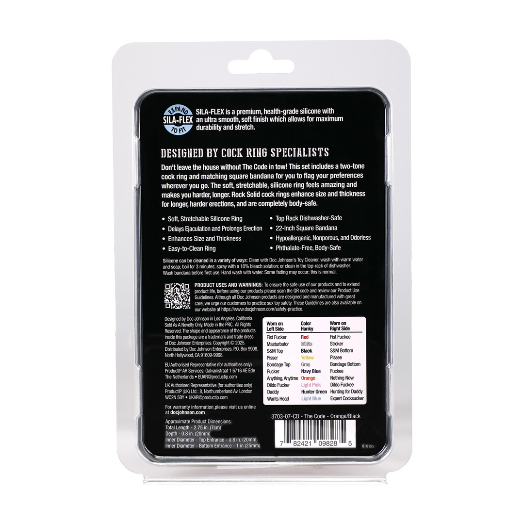 Don’t leave the house without The Code in tow! This set includes a two-tone cock ring and matching square bandana for you to flag your preferences wherever you go. The soft, stretchable, silicone ring feels amazing and makes you harder, longer. Rock Solid cock rings enhance size and thickness for longer, harder erections, and are completely body-safe.