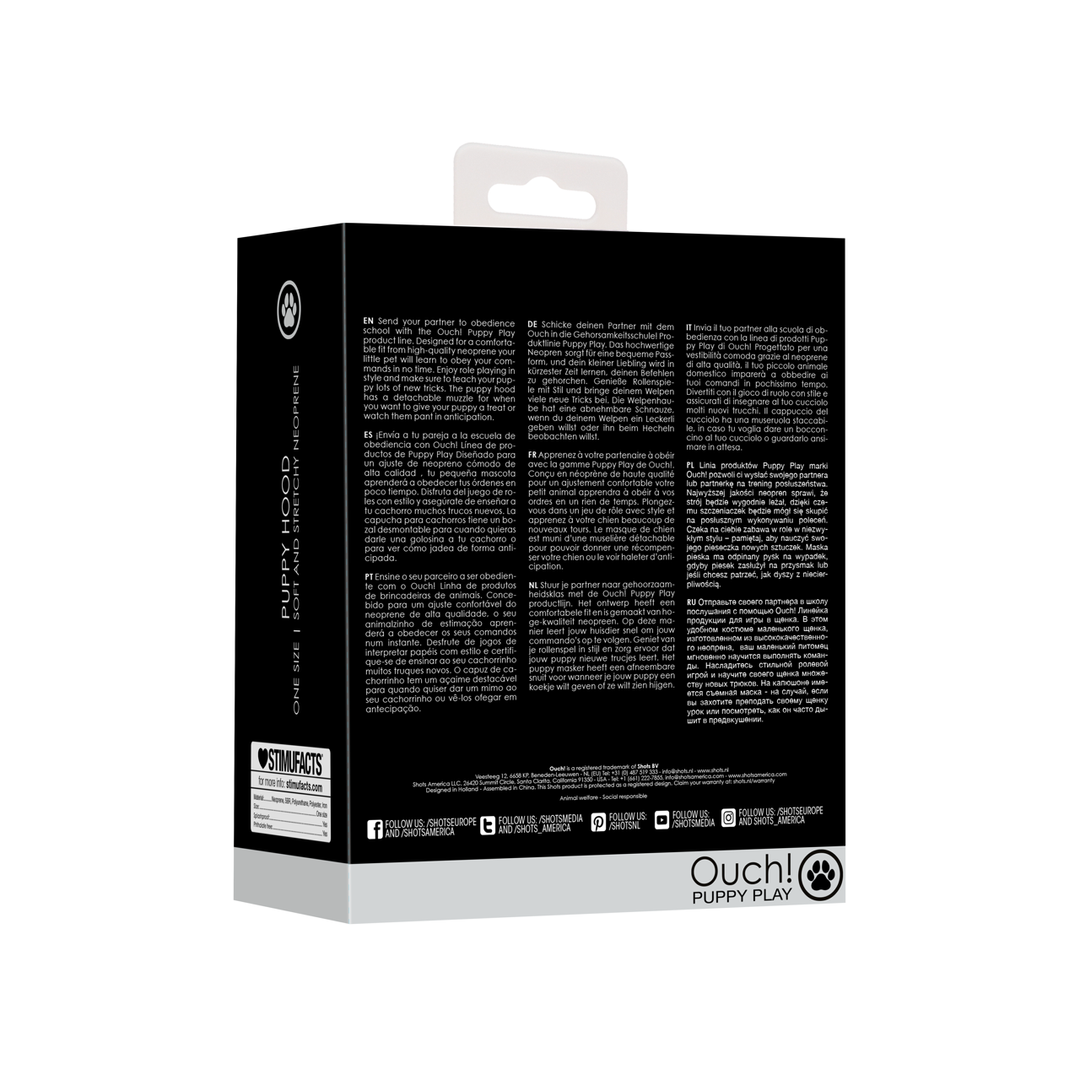 Stuur je partner naar de gehoorzaamheidsschool met de Ouch! Puppy Play productlijn. Ontworpen voor een comfortabele pasvorm van hoogwaardig neopreen, zal je kleine huisdier in een mum van tijd leren om je commando’s op te volgen. Geniet van rollenspel in stijl en zorg ervoor dat je je puppy veel nieuwe trucjes leert. De puppykap heeft een afneembare muilkorf voor wanneer je je puppy een traktatie wilt geven of ze wilt zien hijgen van verwachting.