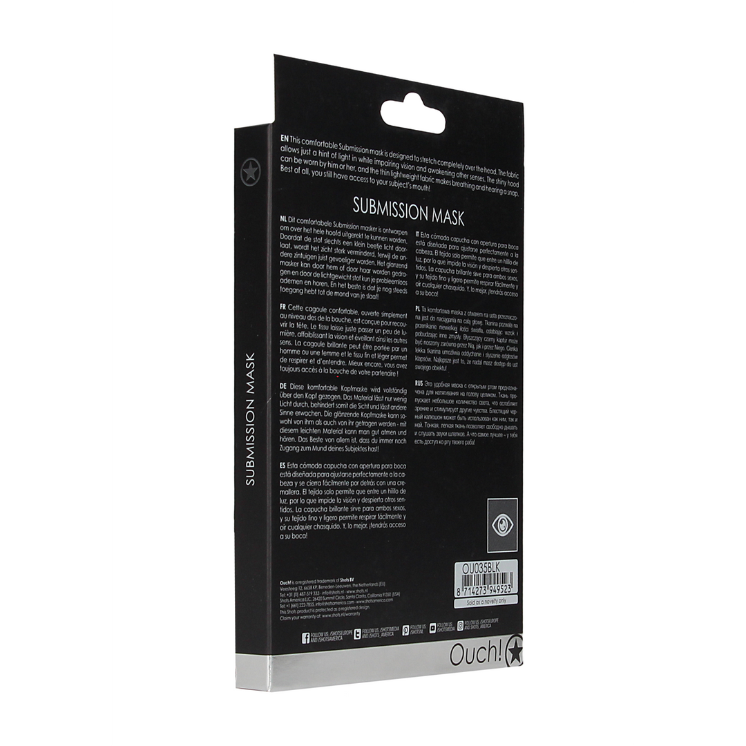 Dit comfortabele Submission masker is ontworpen om over het hele hoofd uitgerekt te kunnen worden. Doordat de stof slechts een klein beetje licht door- laat, wordt het zicht sterk verminderd, terwijl de an- dere zintuigen juist gevoeliger worden. Het glanzend masker kan door hem of door haar worden gedra- gen en door de lichtgewicht stof kun je probleemloos ademen en horen. En het beste is dat je nog steeds toegang hebt tot de mond van je slaaf!