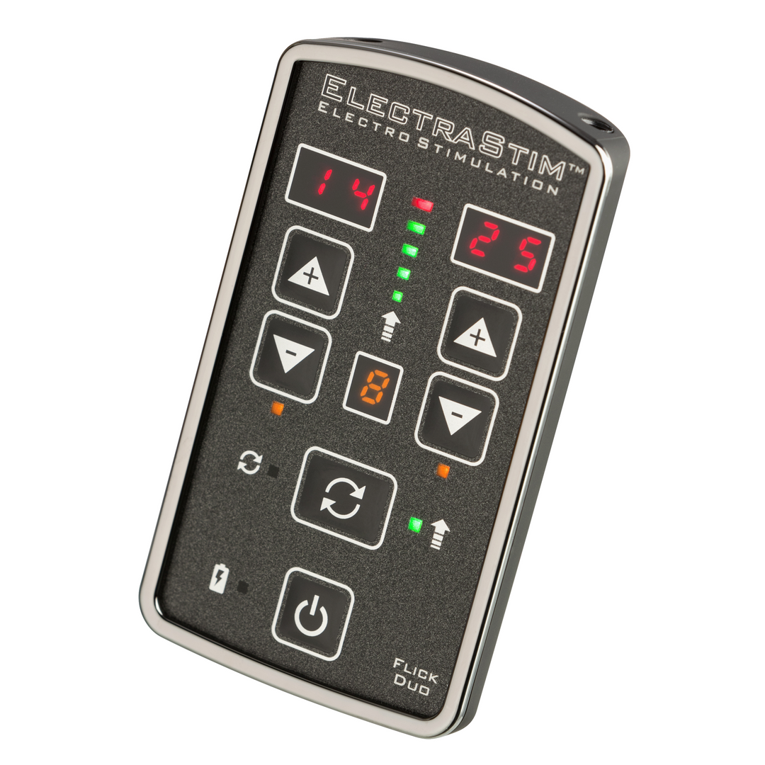 Het ElectraStim Flick EM80-M pakket bevat een Flick Duo dubbelkanaals stimulator, alle benodigde kabels en een set van 4 ElectraPads, 2 ElectraLoops verstelbare cockringen en een siliconen Noir Aura elektrode (geschikt voor vaginaal en anaal gebruik).Probeer de 4 Flick-standen voor stimulatie die meedoet met een ’tikkende’ polsbeweging voor echt aanpasbare patronen.Kenmerken van de stimulator8 verschillende stimulatiepatronen4 bewegingssympathieke Flick-instellingen – stimuleer met behulp van een tikkende beweging via één of beide kanalen25 intensiteitniveaus2 geïsoleerde stimulatiekanalen – Individuele intensiteitbediening voor elk kanaalUsb-oplaadbaar3 jaar garantie wanneer u uw aankoop registreertInclusiefEM80-stimulator4 geleidende pads Siliconen Noir Aura elektrode (3 inch inbrengbaar x 3,3 inch in omtrek)2 ElectraLoops cockringen (instelbaar tot 2,75 inch in diameter)Tube geleidende gel van 60 ml2 aansluitkabel (2mm pinaansluiting)Usb-oplaadkabelOpbergetui