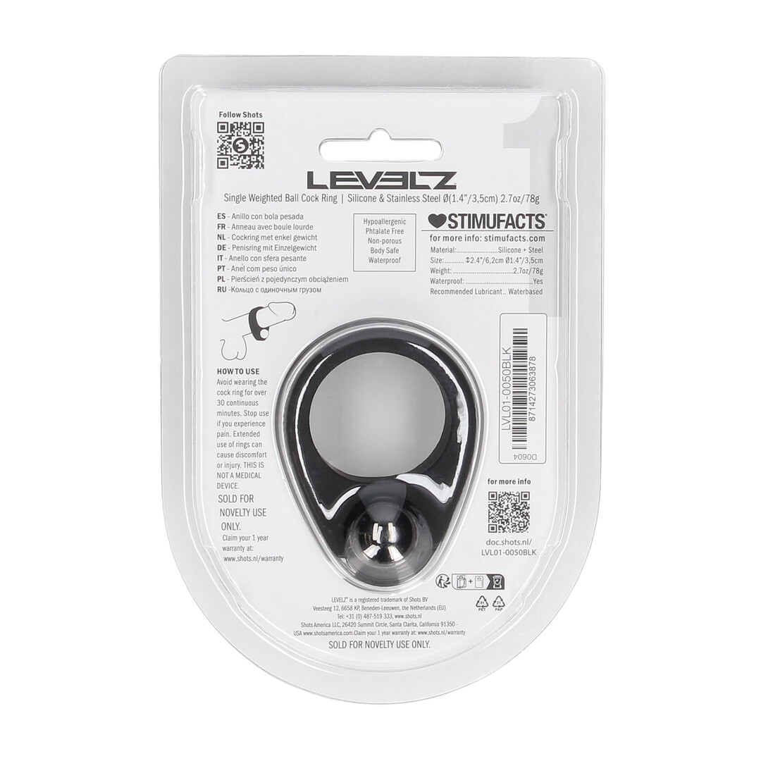 Level up with added intensity. This single weighted cock ring from the LEVELZ collection combines the firm grip of premium silicone with an internal weight for extra pressure and a more grounded, full-bodied feel. Perfect for users who crave that satisfying tug during wear. Non-vibrating, body-safe, and packaged in a sleek clamshell for easy display.