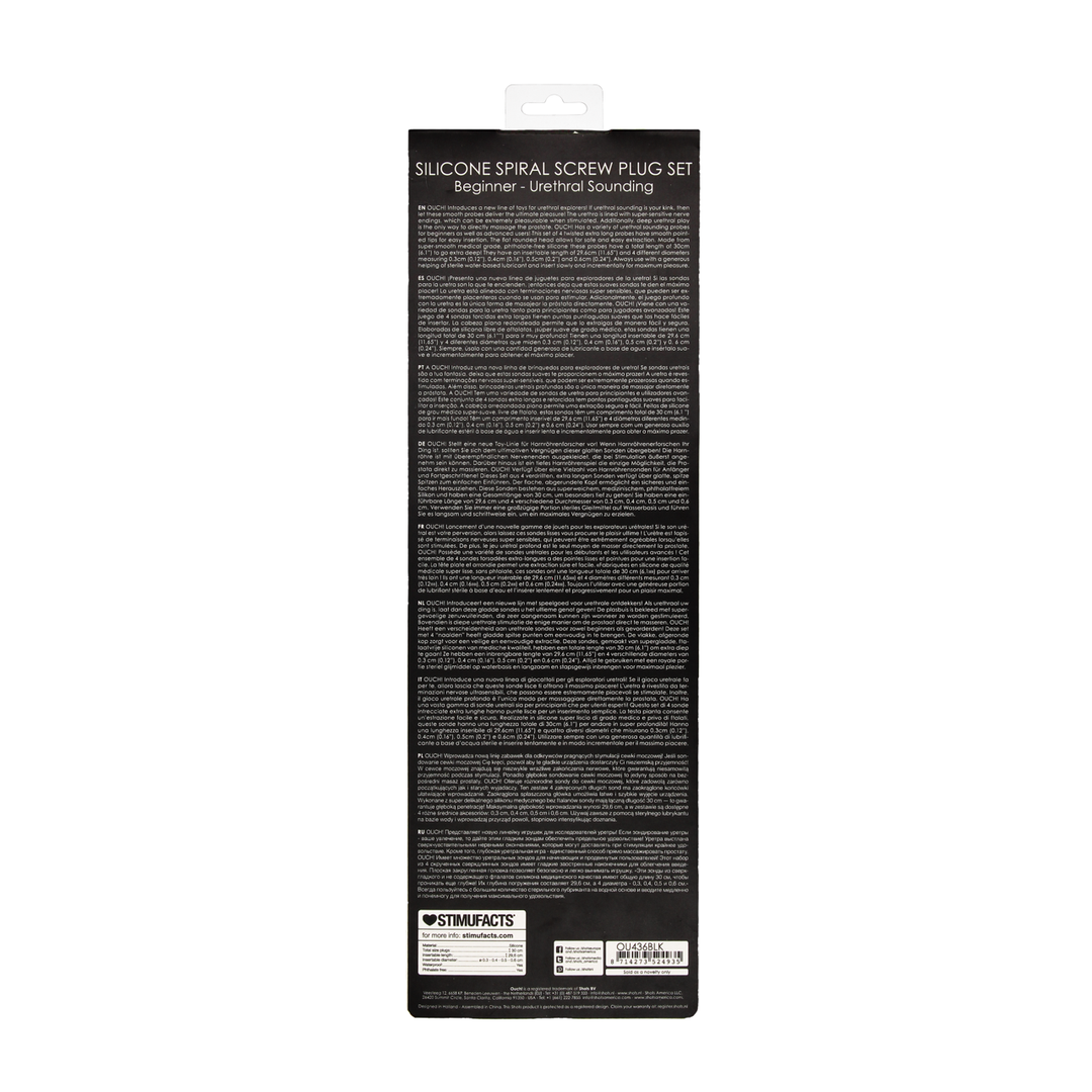 OUCH! Introduceert een nieuwe lijn met speelgoed voor urethrale ontdekkers! Als urethraal uw ding is, laat dan deze gladde sondes u het ultieme genot geven! De plasbuis is bekleed met supergevoelige zenuwuiteinden, die zeer aangenaam kunnen zijn wanneer ze worden gestimuleerd. Bovendien is diepe urethrale stimulatie de enige manier om de prostaat direct te masseren. OUCH! Heeft een verscheidenheid aan urethrale sondes voor zowel beginners als gevorderden! Deze set met 4 “naalden heeft gladde spitse punten om eenvoudig in te brengen. De vlakke, afgeronde kop zorgt voor een veilige en eenvoudige extractie. Deze sondes, gemaakt van supergladde, ftalaatvrije siliconen van medische kwaliteit, hebben een totale lengte van 30 cm (6,1) om extra diep te gaan! Ze hebben een inbrengbare lengte van 29,6 cm (11,65) en 4 verschillende diameters van 0,3 cm (0,12), 0,4 cm (0,16), 0,5 cm (0,2) en 0,6 cm (0,24). Altijd te gebruiken met een royale portie steriel glijmiddel op waterbasis en langzaam en stapsgewijs inbrengen voor maximaal plezier.