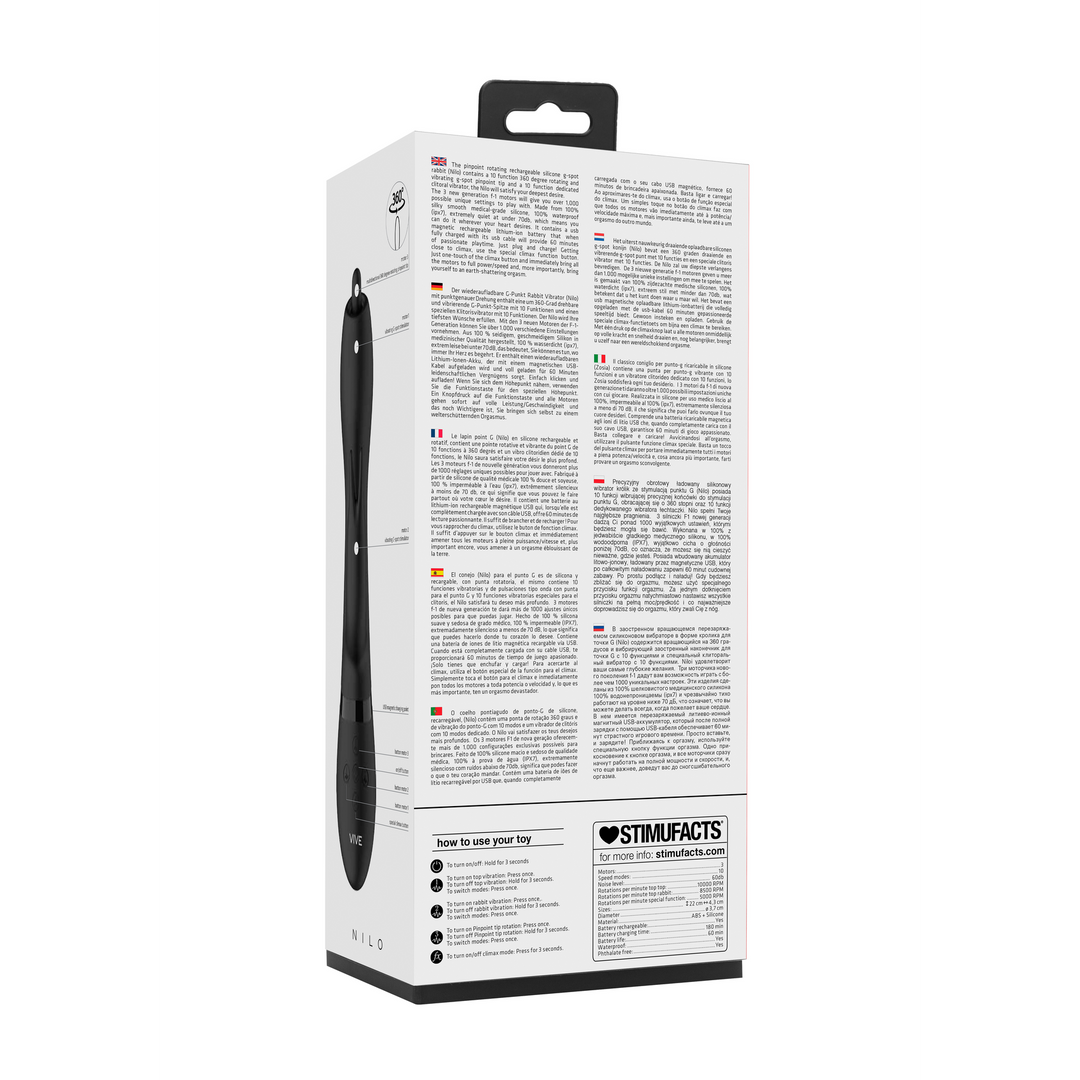 Het uiterst nauwkeurig draaiende oplaadbare siliconen g-spot rabbit (Nilo) bevat een 360 graden draaiende en vibrerende g-spot punt met 10 standen en een speciale clitoris vibrator met 10 standen. De Nilo zal uw diepste verlangens bevredigen. De 3 nieuwe generatie f-1 motoren geven u meer dan 1.000 mogelijke unieke standen om mee te spelen. Het is gemaakt van 100% zijdezachte medische siliconen, 100% waterdicht (ipx7) en extreem stil met minder dan 60db. Wordt geleverd met een magnetische USB oplaadbare lithium-ionbatterij die volledig opgeladen 50 minuten gepassioneerde speeltijd biedt. Met een druk op de climax knop laat u alle motoren onmiddellijk op volle kracht en snelheid draaien en, nog belangrijker, het brengt u naar een wereldschokkend orgasme.