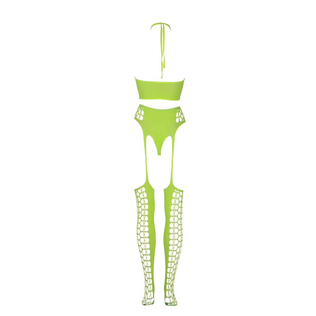 Twee Delige Set met Crop Top en Kousen – One Size – Neon Groen omarmt je vormen met elegantie, stijl en een subtiele vleug van verleiding.