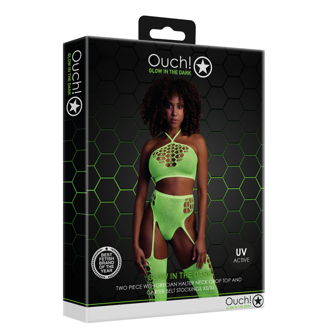 Vibrant Crop Top: The Neon Two-Piece with Crop Top and Stockings is a vibrant ensemble that includes a striking crop top, adding a bold and playful element to your wardrobe.Matching Stockings: Coordinated with matching stockings, this two-piece set creates a cohesive and eye-catching look, making it ideal for both party wear and intimate moments.Comfortable Stretch: Crafted with comfortable, easy-to-fit, stretchy materials, this ensemble ensures a snug and flattering fit. Choose from neon pink or neon green to make a statement and light up the night with UV-activated allure./