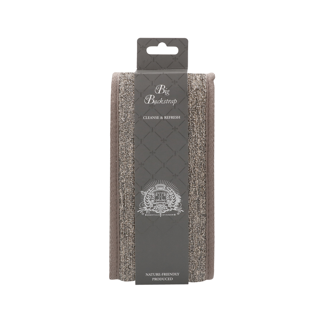 The Touché Big Back Strap gives you easy access to those difficult-to-reach areas on your body!One side is silky smooth for a gentle polishing cleanse.The other side has a rough scrub surface for a thorough tingling exfoliation.The Charcoal component helps to draw out daily impurities and gently remove the build up of dirt and toxins from your pores.The natural fibres of Hemp and Flax are ideal for exfoliating and provide an all-over healthy glow to your skin./