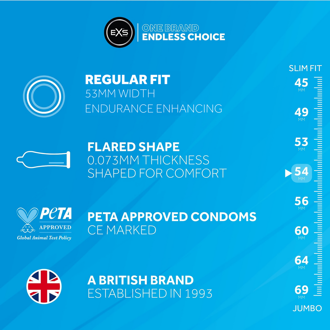 Condooms met natuurlijke latex, speenuiteinden en siliconengesmeerd EXS Endurance Delay-condooms zijn 53 mm met rechte wanden en gemaakt van natuurlijke latex. Elk condoom is aan de buitenkant gesmeerd (hoewel extra glijmiddel misschien nodig is) en heeft een 1% lidocaïne verdovend glijmiddel aan de binnenkant dat in de kop van de penis moet worden gemasseerd. EXS Endurance Delay condooms zorgen ervoor dat je langer meegaat tijdens het vrijen!